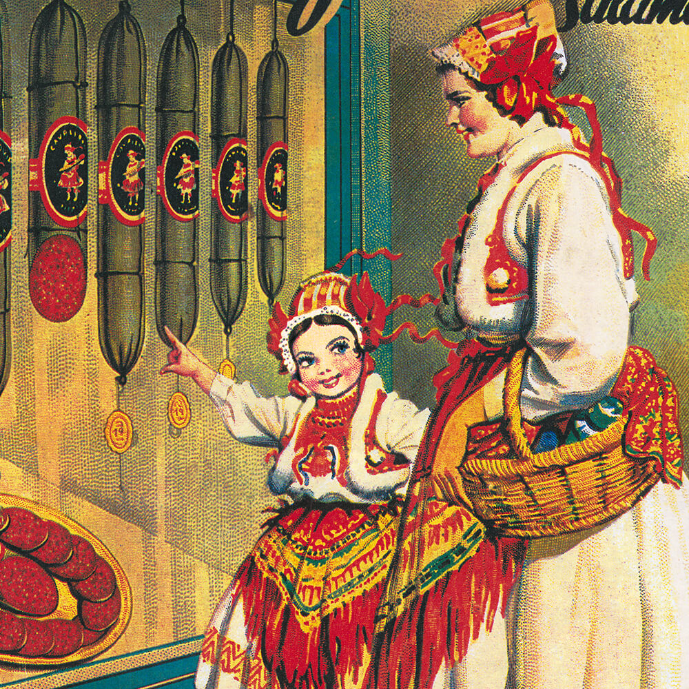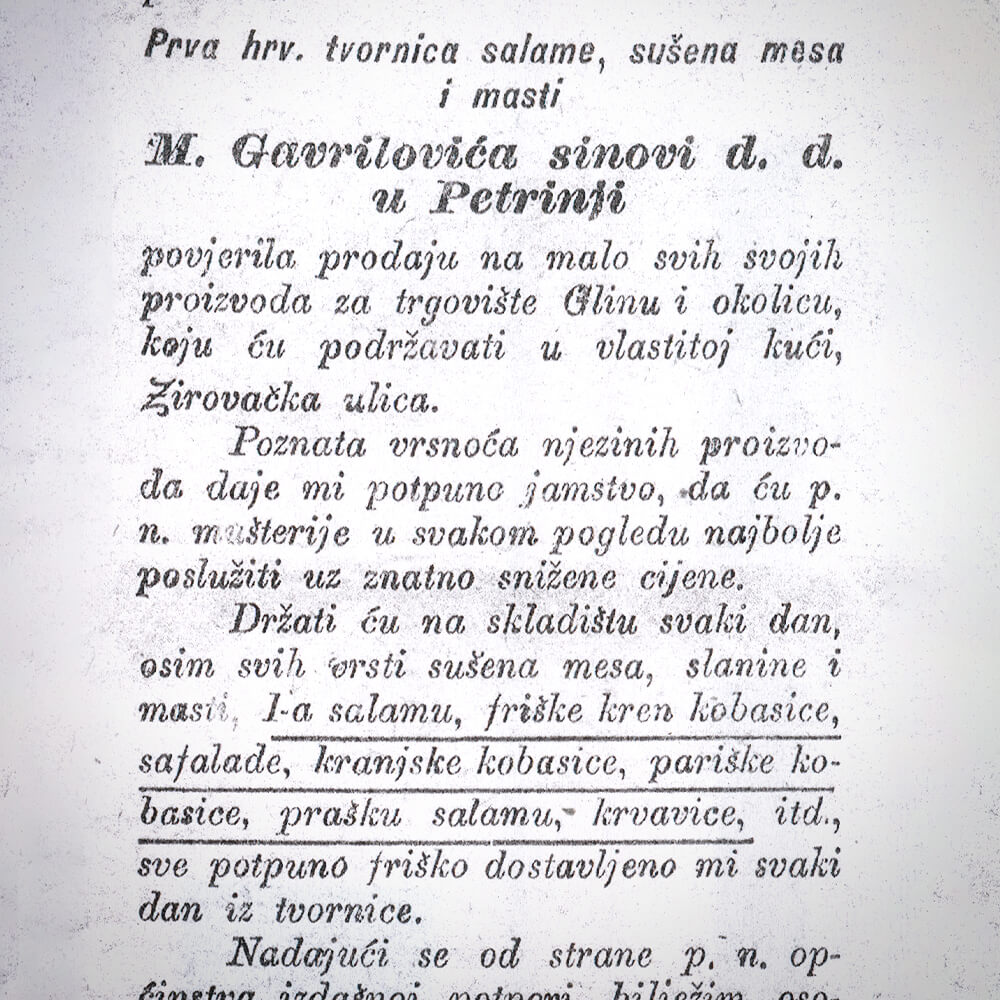 „Poznata vrsnoća njezinih proizvoda daje mi potpuno jamstvo, da ću poštovane mušterije u svakom pogledu najbolje poslužiti…na skladištu svaki dan držati osim svih vrsti sušena mesa, slanine i masti, i 1-a salamu, friške hren kobasice, safalade, kranjske kobasice, pariške kobasice, prašku salamu, krvavice itd. sve potpuno friško dostavljeno mi svaki dan iz tvornice…“